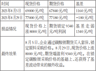 2025年8月初,企业要为订单采购原料,其预判未来1~2个月碳酸锂价格将震荡上行,当时的6.7万~6.8万元/吨属于相对低位。因担心后续采购及月末集中补库时现货价格上涨,同时大单采购难以获取低价货源,企业在期货市场买入碳酸锂合约,以锁定远期生产成本。