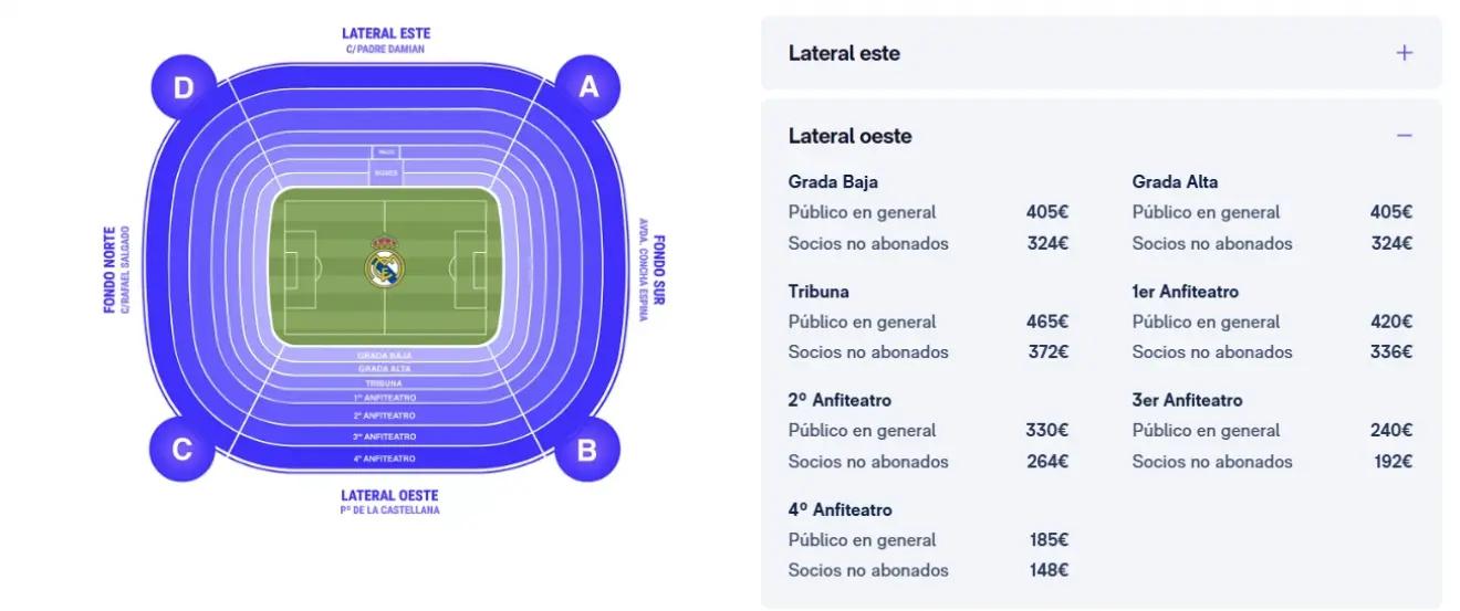 伯纳乌球场的8万张球票里,最便宜的价格,是135欧元(约合1120人民币),是第四层露天看台的位置,观赛效果不好。普通看台的最高票价则达到465欧元(近年来的最高记录)。两侧主看台的票价是405欧元,两端看台(球门区域)的票价是325欧元。VIP区的票价是990欧元起步。