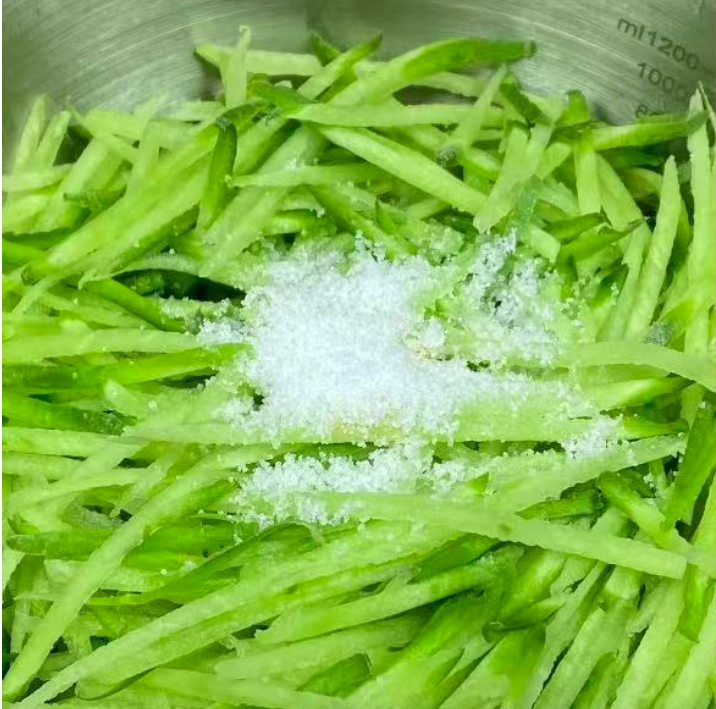 2、萝卜切丝后先用盐腌制杀出辛辣的水分,这样吃起来萝卜丝更脆甜好吃。