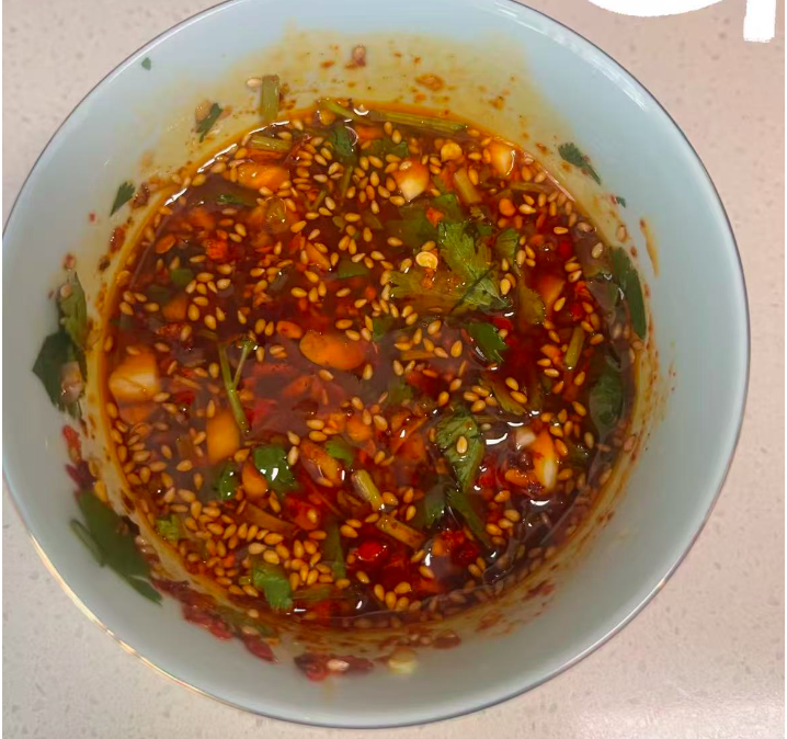 9、准备一个自己喜欢的蘸料汁搭配着一起吃。这里是蒜蓉、辣椒油、熟芝麻、葱花、香菜、少许的醋、盐混合拌匀,来点香油和花椒油吃起来味道更香。